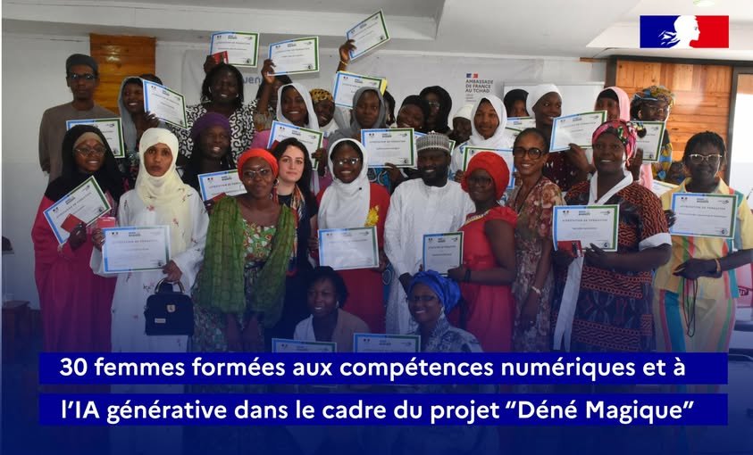 في إطار مشروع ESR 2025 “Déné Magique” الممول من السفارة الفرنسية في تشاد والمنفذ من قبل منظمة WenakLabs، تم تدريب 30 امرأة تشادية على استخدام الأدوات الرقمية، والذكاء الاصطناعي التوليدي، وإنشاء المحافظ الرقمية (Portfolios Digitaux).