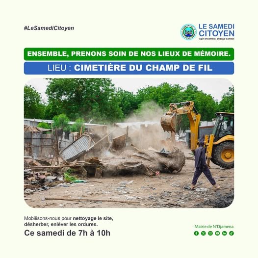 أطلقت بلدية نجامينا دعوة واسعة للمشاركة في يوم تنظيف مواطن، المقرر هذا السبت، بهدف إعادة الكرامة لمقبرة شامب دو فيل الواقعة في الدائرة الخامسة للعاصمة. وتشمل الأعمال المقررة لهذه المبادرة التضامنية تنظيف الموقع بالكامل، إزالة الأعشاب الضارة، وجمع النفايات والمخلفات.